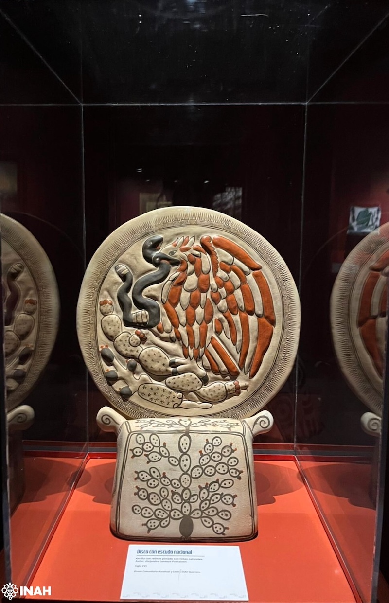 De ese poblado, ubicado en el municipio de Tepecoacuilco de Trujano, proviene una de las piezas estelares de la exposición, la cual pertenece al acervo del Museo Comunitario “Macehual Tlalxihuayotl Calli” y en su decorado retoma el conocido episodio del águila posada sobre un nopal mientras devora una serpiente, señal que habría anunciado a los mexicas el lugar donde fundar su capital.
