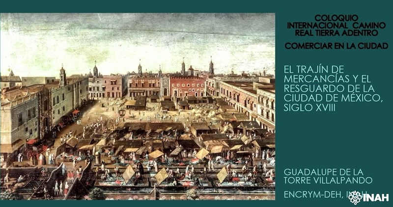 En la conferencia El trajín de mercancías y el sistema de resguardo en la Ciudad de México, la especialista destacó que la capital novohispana funcionó como nodo distribuidor de productos, los cuales, en última instancia, se comercializaban en la alcaicería -hoy Portal de Mercaderes, Plaza de la Constitución- y en el Mercado de El Volador -actual sede de la Suprema Corte de Justicia de la Nación-.