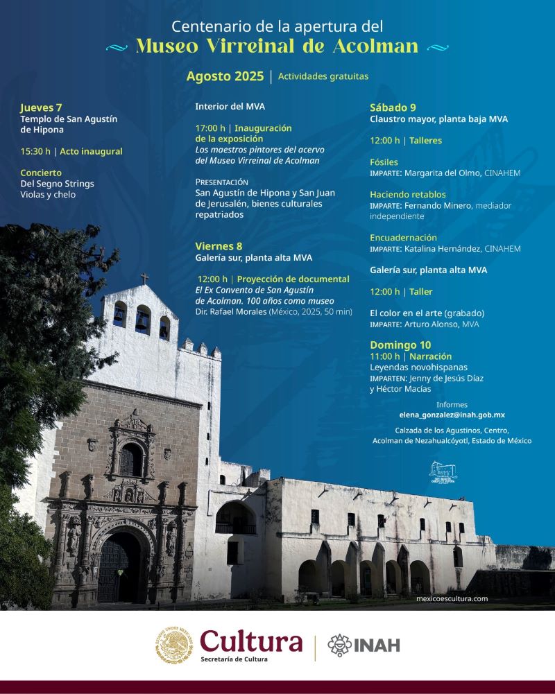 El Museo Virreinal de Acolman (MVA), uno de los primeros repositorios adscritos al Instituto Nacional de Antropología e Historia (INAH), tras su creación en 1939, celebrará el centenario de su apertura al público con una serie de actividades gratuitas, programadas del 7 al 10 de agosto de 2025, que incluye exposiciones, talleres, un concierto y la proyección de un documental.