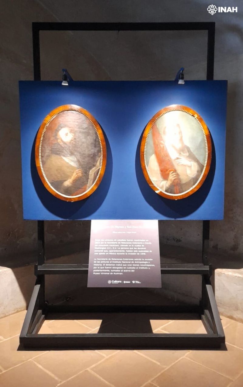 Ese mismo día, se presentarán dos pinturas de caballete de pequeño formato, las cuales fueron repatriadas de Estados Unidos en 2023, a través de la Dirección de Registro Público de Monumentos y Zonas Arqueológicos e Históricos del INAH. Las obras muestran a los santos Agustín de Hipona y Juan de Jerusalén, y datan del siglo XVIII.