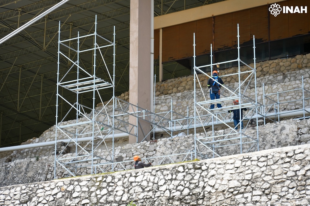 El arqueólogo detalló que se hicieron calas de sondeo arqueológico en el lado norte y oeste de la edificación para corroborar lo planteado por los estudios de prospección, e identificar el desplante de la estructura en relación con la roca madre, entender las técnicas constructivas empleadas en su edificación y conocer cómo los procesos naturales de karstificación y erosión de la roca madre intervienen en la estabilidad del edificio.