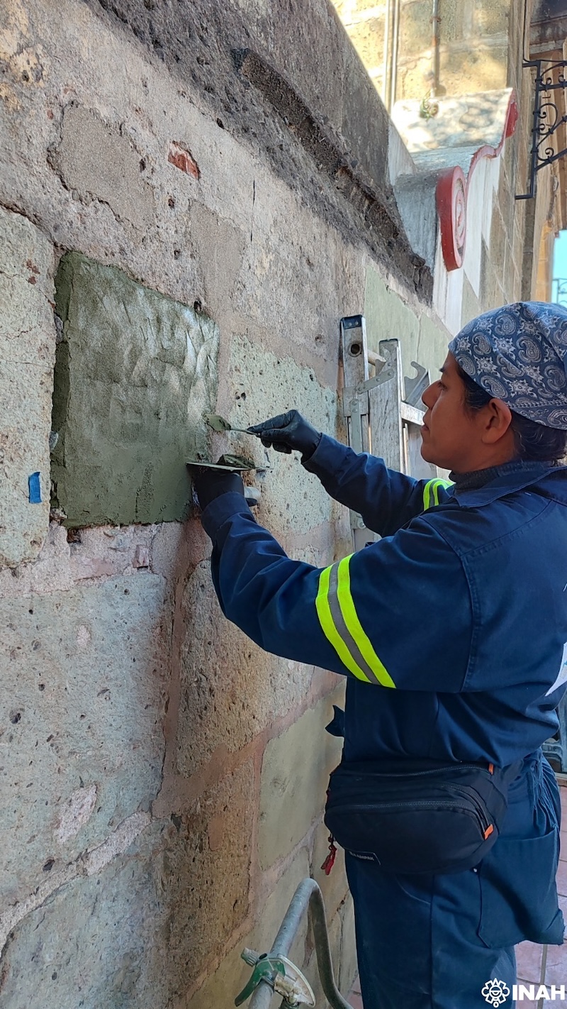 Liliana Domínguez y Donají Jiménez explican que, a lo largo de la barda perimetral donde se encuentran jardineras, el grosor de las capas de pintura vinílica —que se fueron sumando con el tiempo— impedía el tránsito de la humedad, lo que devino en la formación de sales y la paulatina degradación de la cantera.