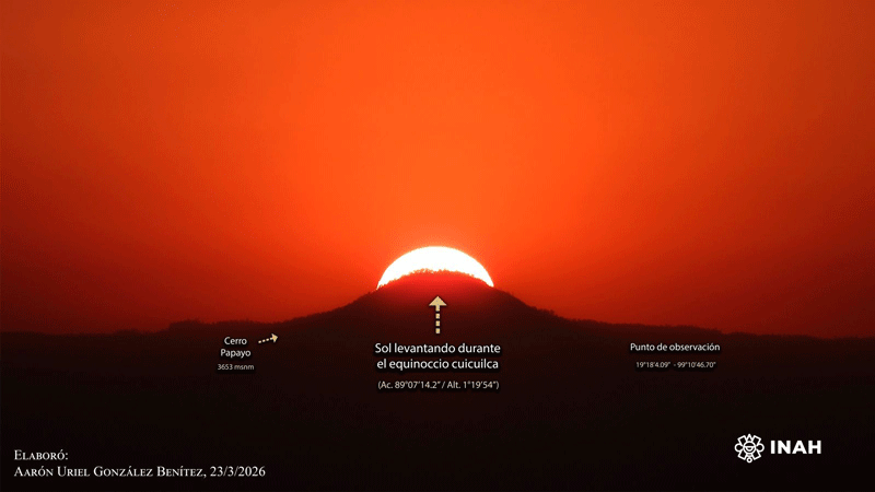 Agregó que las fuentes especializadas señalan que uno de los elementos notables del paisaje orográfico de Cuicuilco A es el cerro Papayo, ubicado al este, ya que coincide con el despunte del sol cerca de los amaneceres equinocciales.
