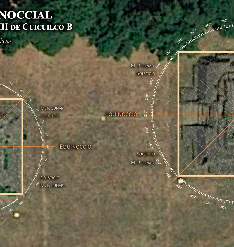 Estos antecedentes académicos se fortalecen gracias a la geometría cuadrangular y la orientación de los edificios VI y VIII de Cuicuilco B, dos monumentos predispuestos hacia el citado montículo y el levante del sol en los días propuestos para el equinoccio cultural cuicuilca, que, de acuerdo con la hipótesis del especialista, tendría lugar entre el 23 y 24 de marzo.