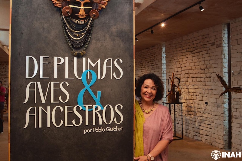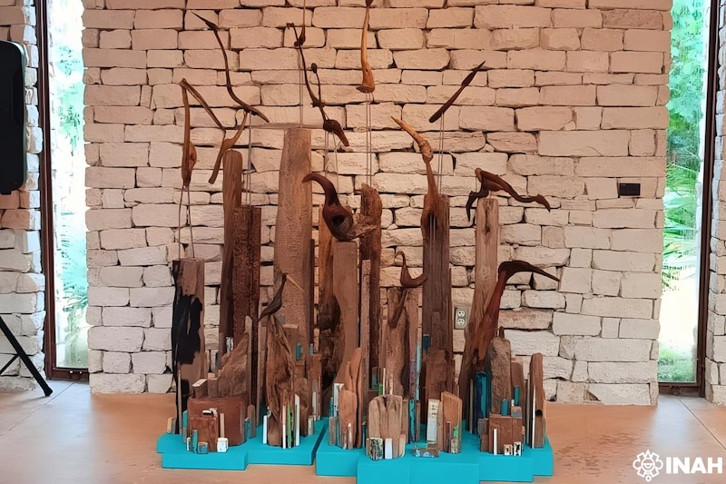 Dispuesta en la Sala Yaxché del Mureco, De plumas, aves y ancestros reúne 12 obras: 10 esculturas alusivas a garzas, pelícanos, gaviotas y flamencos, y dos máscaras.