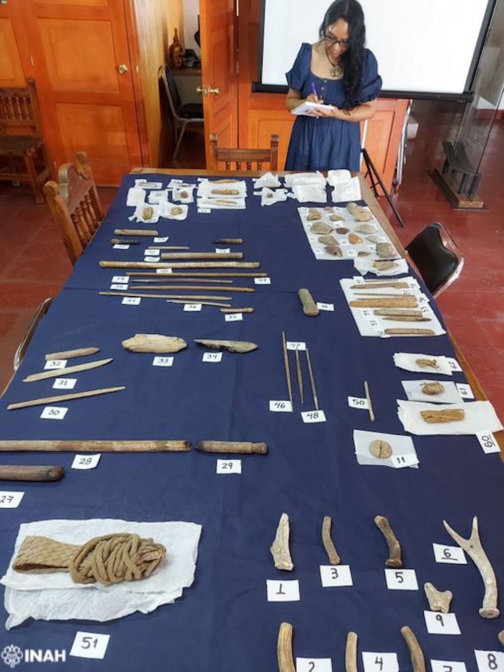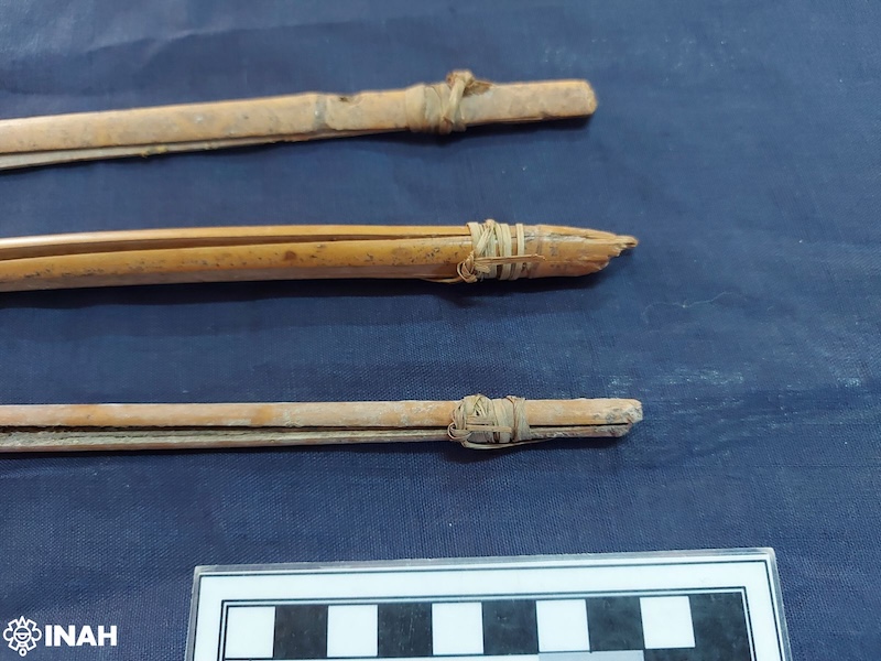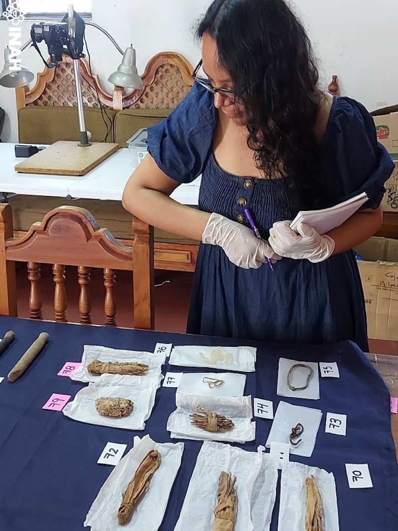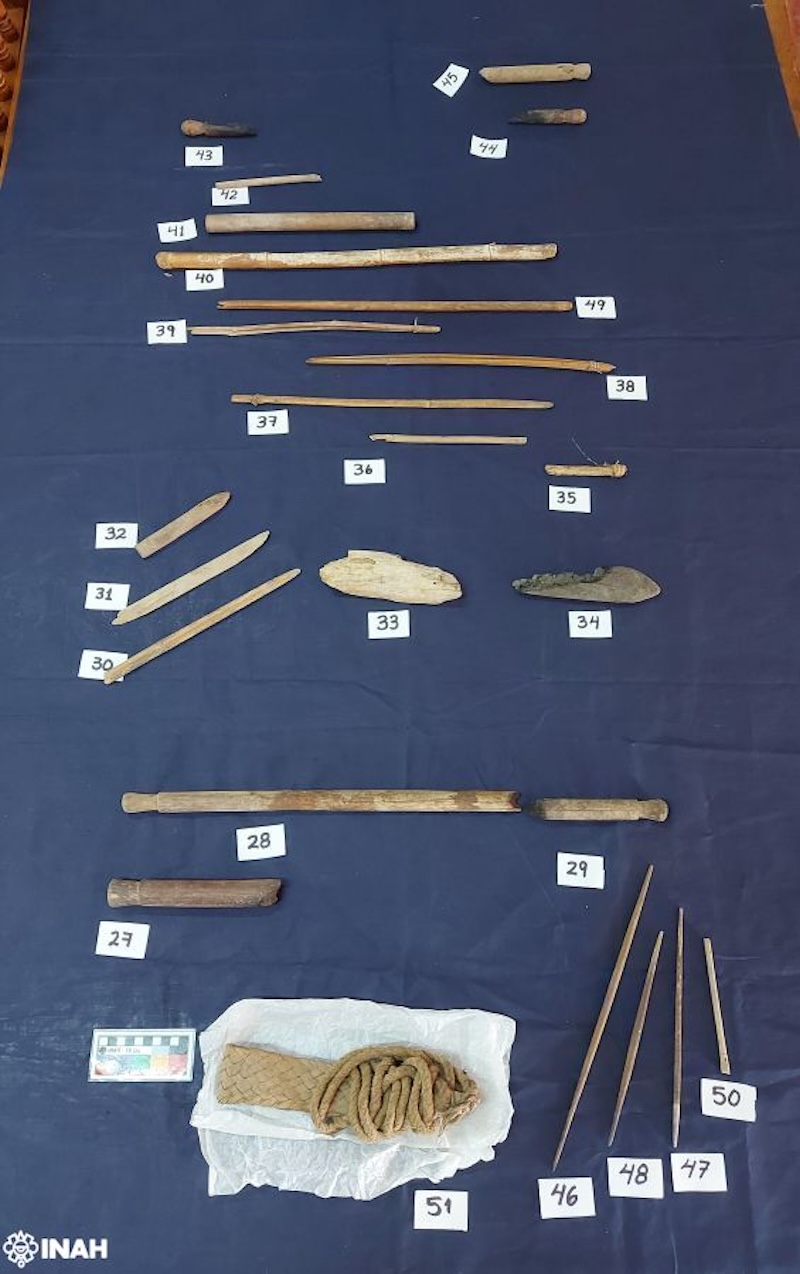 En su estudio previo, la investigadora Elizabeth Jiménez detectó que, del lote formado por 79 objetos, 33 correspondían a partes de telares de cintura: fragmentos de machetes de madera, lanzaderas, palo de calada, agujas y un mecapal extraordinariamente conservado.