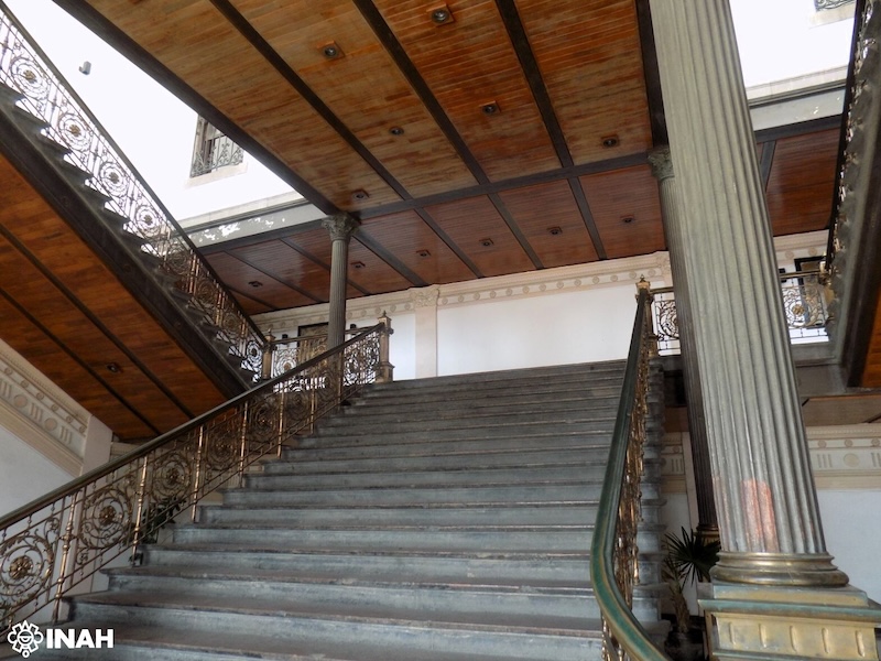 Sobre la historia del inmueble, finaliza que una investigación realizada en 2006, contribuyó a determinar que fue construido a finales del siglo XIX, por instrucción del entonces presidente Porfirio Díaz. Su edificación inició en 1896, a cargo del Ferrocarril Central Mexicano, y muchos de sus elementos constructivos, como la estructura de hierro fundido, ladrillos rojos, madera, granito y aplicaciones en bronce, fueron importados. En el descanso de sus escalinatas, destacan además dos cuadros del Escudo Nacional, hechos con mosaicos venecianos, regalo del gobierno italiano.
