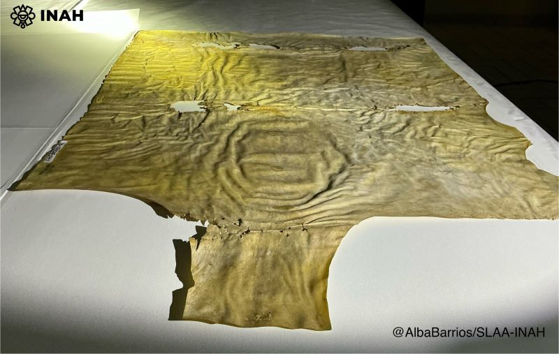 Relativo a la naturaleza orgánica del soporte, la bióloga del Laboratorio de Arqueobotánica de la Subdirección de Laboratorio y Apoyo Académico (SLAA), María Susana Xelhuantzi López, anotó que presenta características morfológicas microscópicas propias de la epidermis de chivo, lo que permitiría situarlo, cronológicamente, en la época colonial.