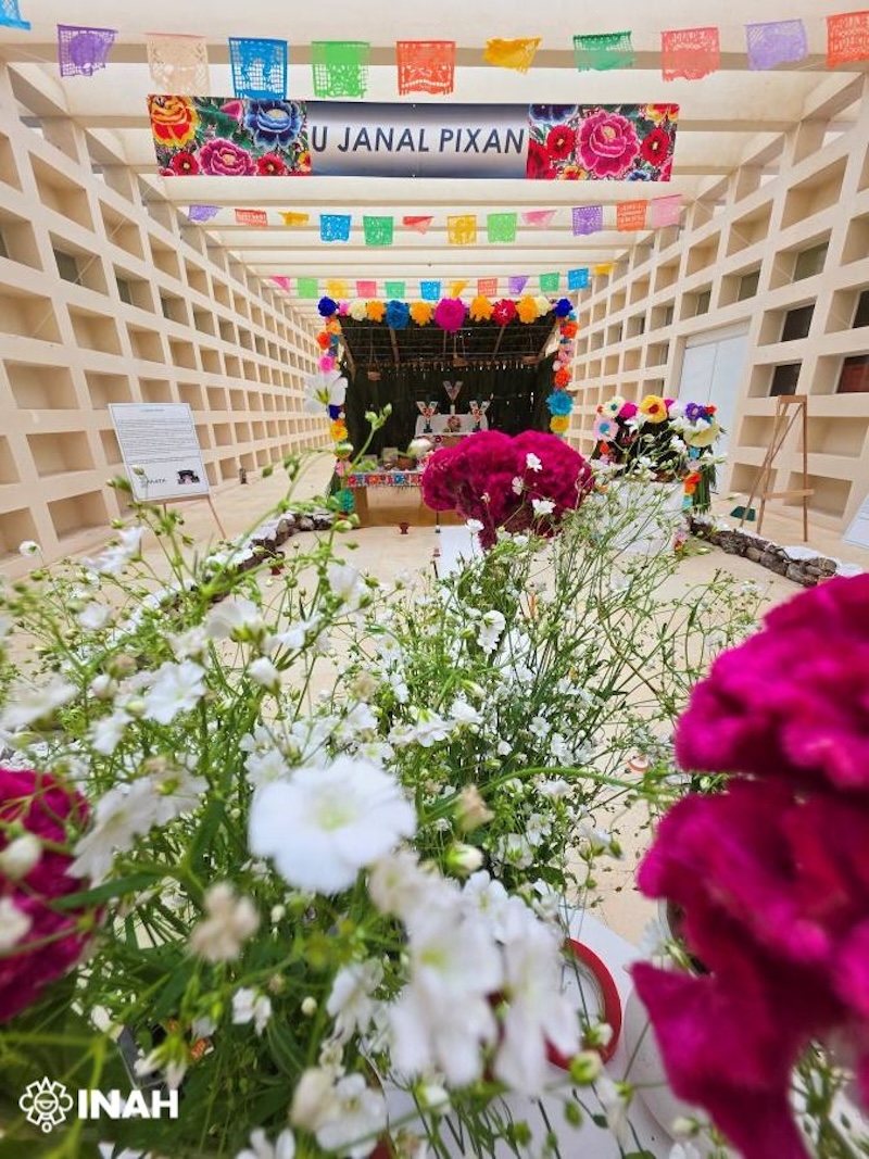 Asimismo, en el vestíbulo del museo, se presentó una monumental ofrenda de aserrín, nombrada Camino al Xibalbá, creada por los artistas plásticos de Isla Mujeres, Marcela Luna y Dhante Loyola, para recibir a las y los visitantes, la cual permanecerá hasta el 5 de noviembre.