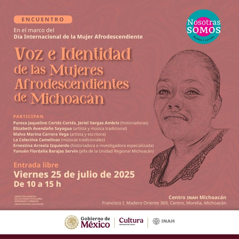 La actividad, que se inscribe en el programa “Nosotras somos. Mujeres y cultura” de la DGCPIU, tendrá lugar el viernes 25 de julio de 2025, fecha en que se conmemora el Día Mundial de la Mujer Afrodescendiente, a las 10:00 horas, en el Centro INAH Michoacán (Av. Francisco I. Madero Oriente 369, Centro Histórico de Morelia).