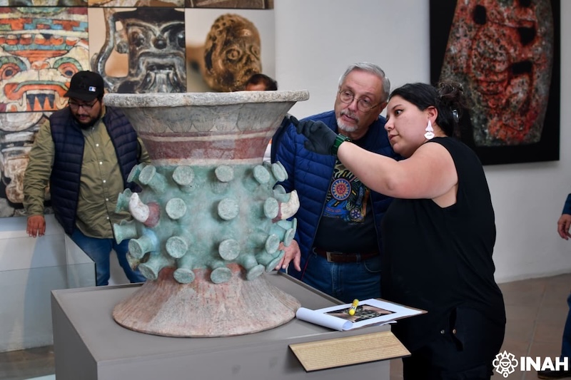 Se trata, dijo, de una pieza única, utilizada para el depósito del pulque azul o matlalxóchitl, que era ingerido por los sacerdotes y los sacrificados; por ello, el borde de la vasija, por la forma y diseños superficiales, da la impresión de ser espuma blanca, que manifiesta el contenido de ese néctar o teometl.