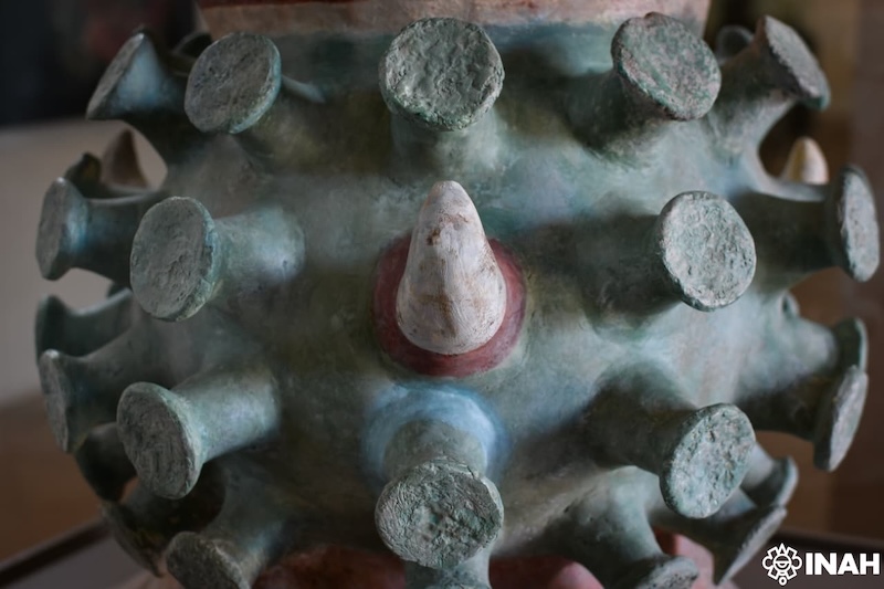 “Todas las aplicaciones de la parte central suman 52 elementos, número relacionado con el atado de años o Xiuhmolpilli del calendario nahua, que marca el fin de un ciclo y la festividad del fuego nuevo. El cuello de la pieza está enmarcado por una línea roja y una franja del mismo color, en cuya sección superior se observan las ya referidas plumas negras, posiblemente de águila”, acotó Martínez Vargas.