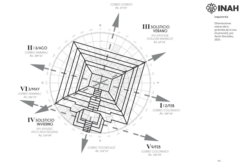 Se propone, por ejemplo, que la Pirámide de la Luna —contrariamente a la creencia popular—, revela, a través de sus ejes de simetría, una profunda identidad solar, pues se alinea con fechas significativas en las que el Sol aparece o desaparece en el horizonte: el 12 de febrero, el 13 de agosto, en los solsticios de verano e invierno, el 3 de mayo y en los nemontemi.