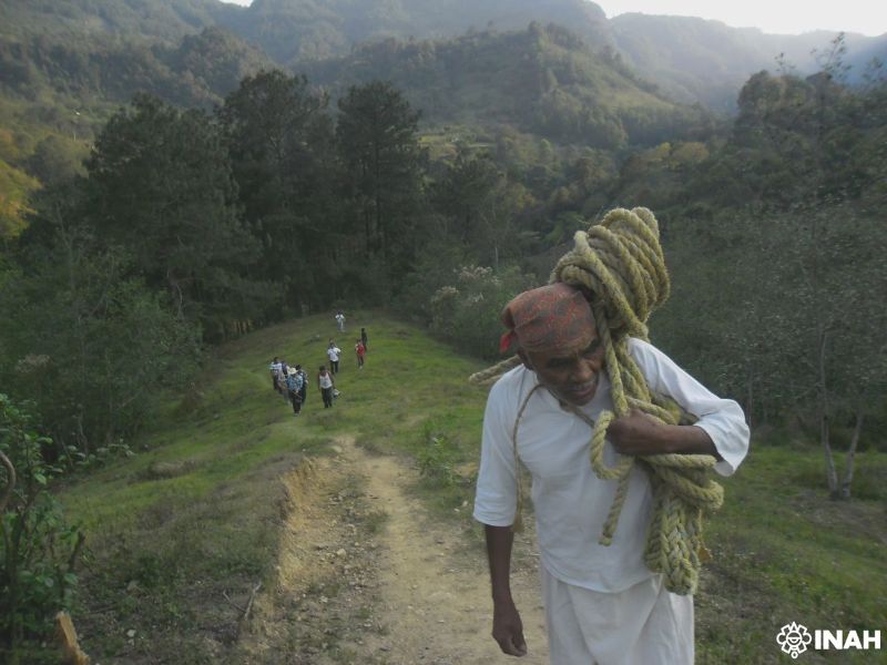 “La imagen muestra el regreso de quienes fueron al monte para seleccionar el árbol, cuyo tronco debe ser alto y recto porque servirá como mástil para la ceremonia del volador. Los grupos de voladores y gente de la comunidad participan ese día y llevan a cabo un rito, con el cual piden permiso para cortar el árbol de alzaprima u hojancho, y durante su traslado lo sahuman y le tocan música”.
