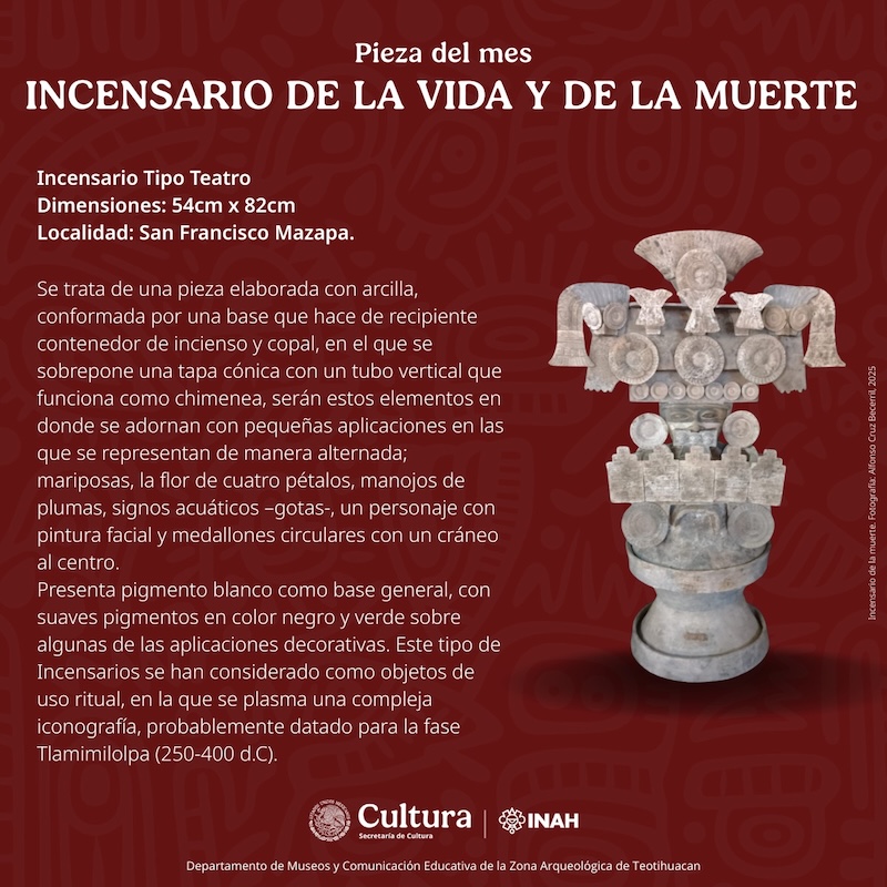 En paralelo, la arqueóloga de la Dirección de Salvamento Arqueológico del INAH, Rosalba Aguilera Muñoz, inauguró la pieza del mes en el MMT, que bajo el título de Incensario de la vida y de la muerte, despliega un incensario tipo teatro de 82 centímetros de alto, hallado en la localidad de San Francisco Mazapa; el objeto, de uso ritual, data de la fase Tlamimilolpa (250-400 d.C.).
