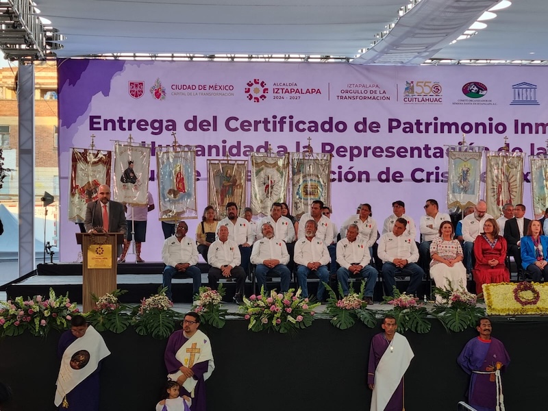 Precedida por el toque de fanfarrias, una fiesta envolvió a la Macroplaza de Iztapalapa para recibir, este miércoles 18 de febrero de 2026, el Certificado de Patrimonio Inmaterial de la Humanidad a la Representación de la Pasión, Muerte y Resurrección de Cristo, el cual fue otorgado por la Organización de las Naciones Unidas para la Educación, la Ciencia y la Cultura (Unesco), tras incluir a dicha manifestación en su Lista Representativa del PCI, el 10 de diciembre de 2025.