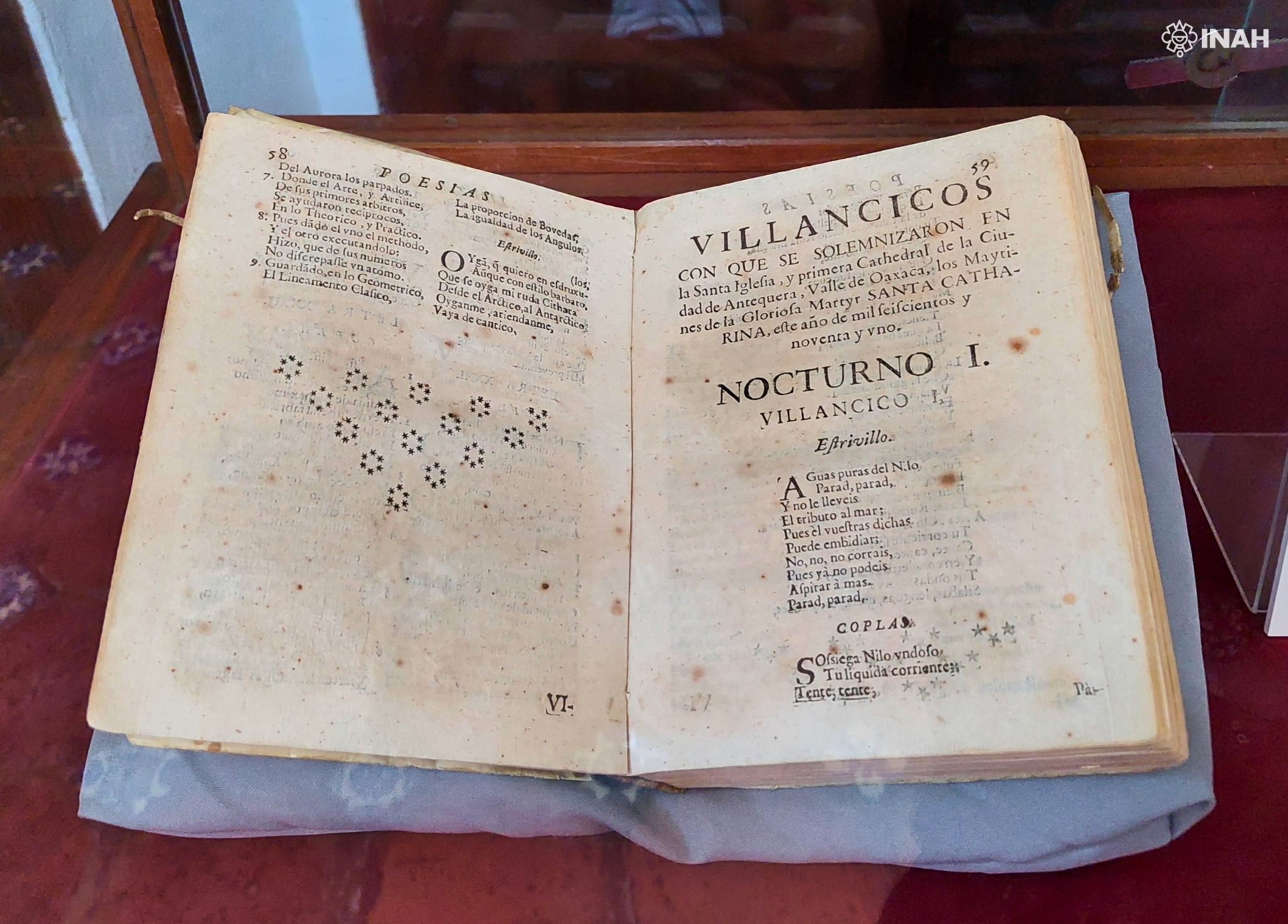 Este ejemplar de los Villancicos, obra escrita por Sor Juana en 1691 para los maitines celebrados en la catedral de Antequera, Oaxaca, en honor de santa Catarina, fue impreso en el siglo XVII y es una muestra del vigor literario y devocional que la monja jerónima ostentaba, pues le fueron encargados personalmente por Manuel Fernández de Santa Cruz, obispo de Puebla y Oaxaca.