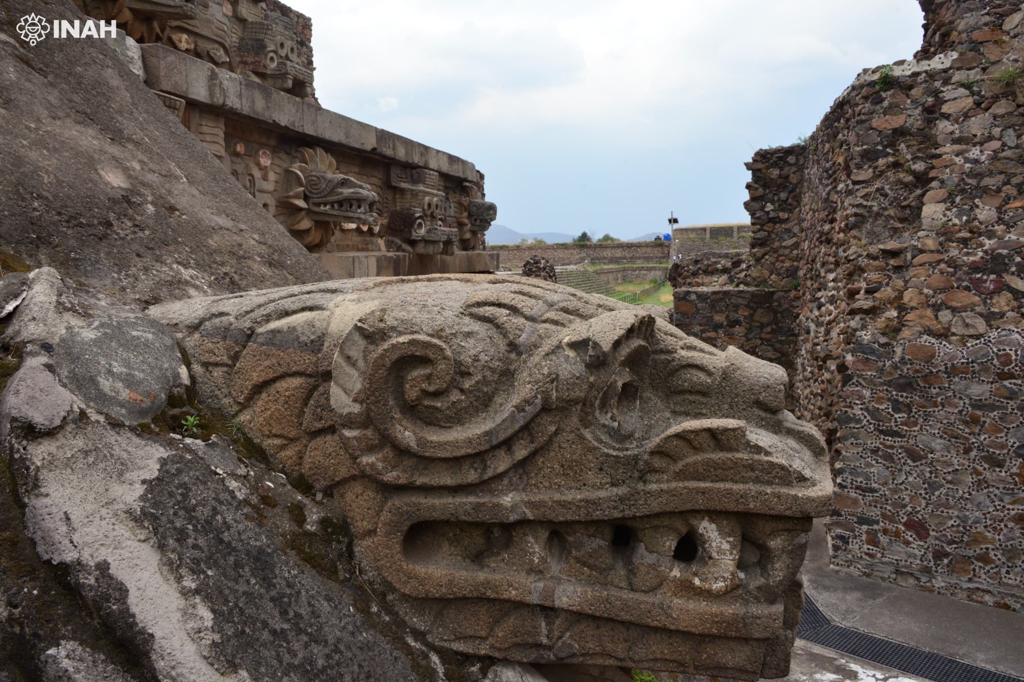 No obstante, deslumbra sobre todo su compleja y exquisita decoración, compuesta por cabezas de serpiente emplumada, las que parecen encontrarse en un medio acuático, como lo indican las conchas y caracoles que se observan entre sus ondulantes cuerpos; prueba de la excelencia escultórica de la época y testimonio monumental del culto a la Quetzalcóatl: una de las divinidades principales del panteón teotihuacano.