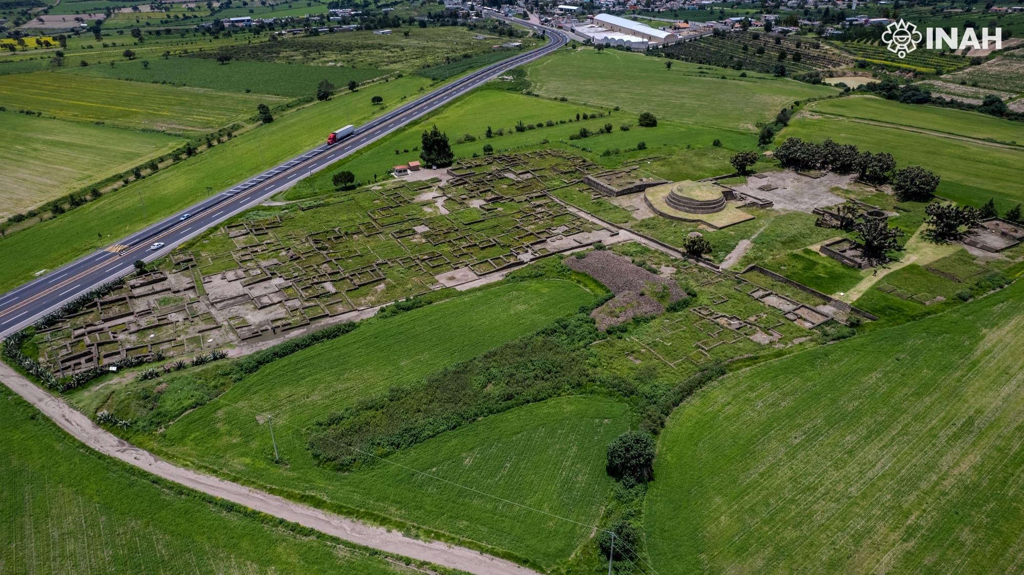 La zona arqueológica consta de tres plazas, edificadas en diferentes niveles. En ellas, sobresale el centro ceremonial y, en su interior, el templo circular dedicado a Ehécatl-Quetzalcóatl, aunque también se rendía culto a deidades como Tláloc, Tezcatlipoca, Mictlantecuhtli y Mayahuel.