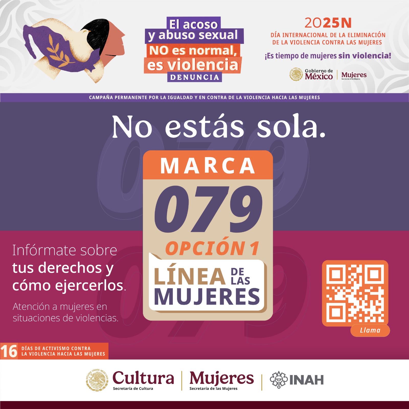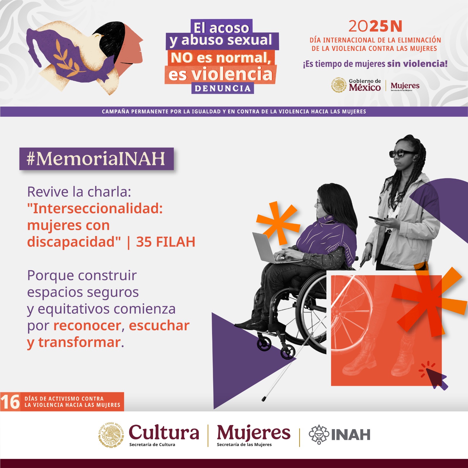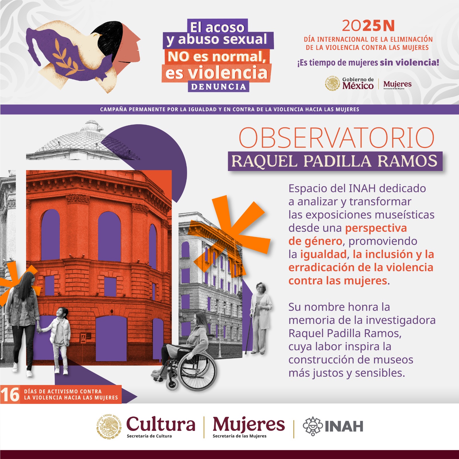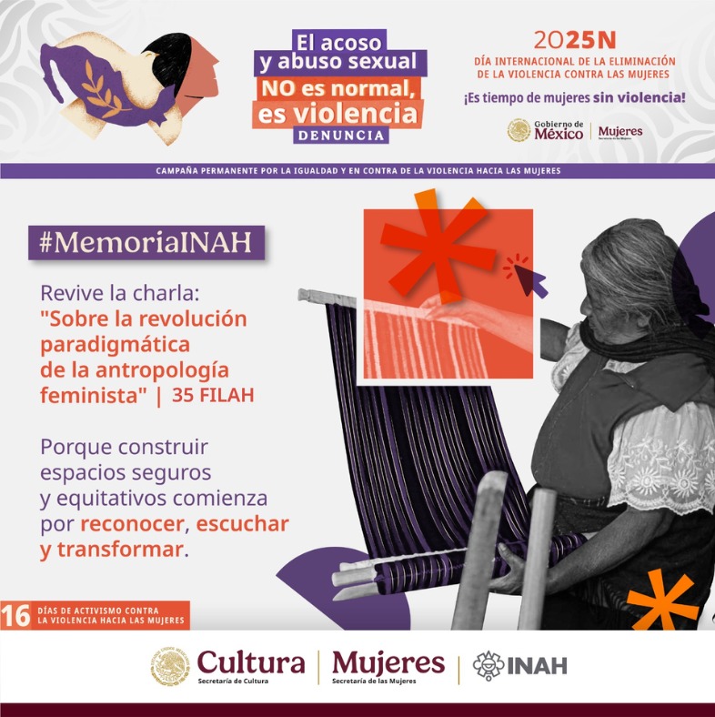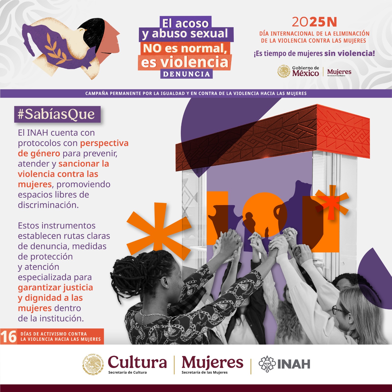 El Instituto Nacional de Antropología e Historia (INAH) se suma a la conmemoración del Día Internacional de la Eliminación de la Violencia contra la Mujer y a la campaña internacional de los “16 días de activismo contra la violencia de género”, que culmina el 10 de diciembre, Día Internacional de los Derechos Humanos.
