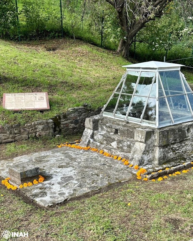 Bajo una cubierta de vidrio que permite observarlos desde el exterior, los restos óseos de un hombre y de una mujer, emplazados en el espacio conocido como Altar de los Cráneos Esculpidos, en la Zona Arqueológica de Cholula (ZAC), en Puebla, podrán ser apreciados durante la conmemoración del Día de Muertos, los días 31 de octubre, 1 y 2 de noviembre de 2025.