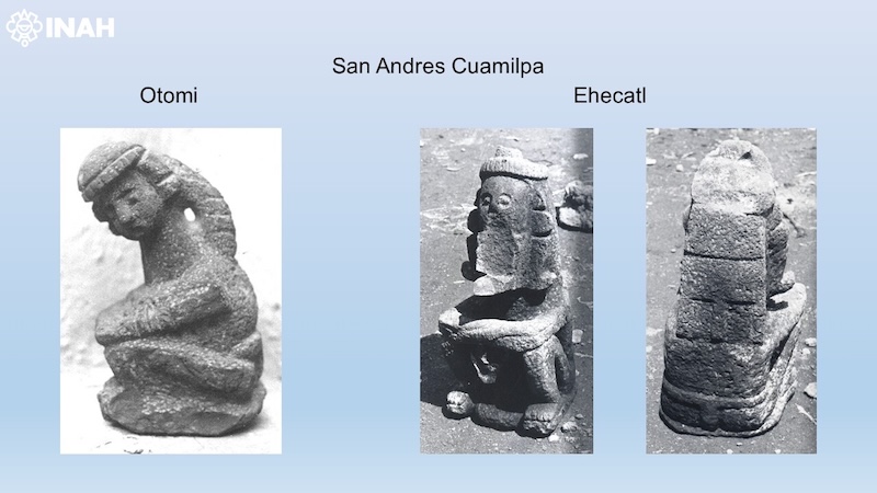 Dos de estas piezas fueron entregadas en los años ochenta al arqueólogo Santana, por vecinos de San Andrés Cuamilpa, municipio de Tetlatlahuca: una representa a un guerrero otomí (identificado por su tocado), y la otra, a la deidad Ehécatl; respecto a la tercera, que solo es un rostro, se halló en el municipio de Nativitas, y también se asocia a un guerrero otomí. Actualmente, las tres efigies son parte de la colección del Museo Regional de Tlaxcala.