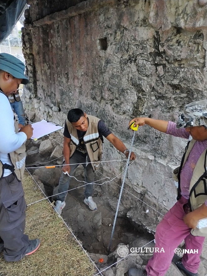 El arqueólogo detalló que se hicieron calas de sondeo arqueológico en el lado norte y oeste de la edificación para corroborar lo planteado por los estudios de prospección, e identificar el desplante de la estructura en relación con la roca madre, entender las técnicas constructivas empleadas en su edificación y conocer cómo los procesos naturales de karstificación y erosión de la roca madre intervienen en la estabilidad del edificio.