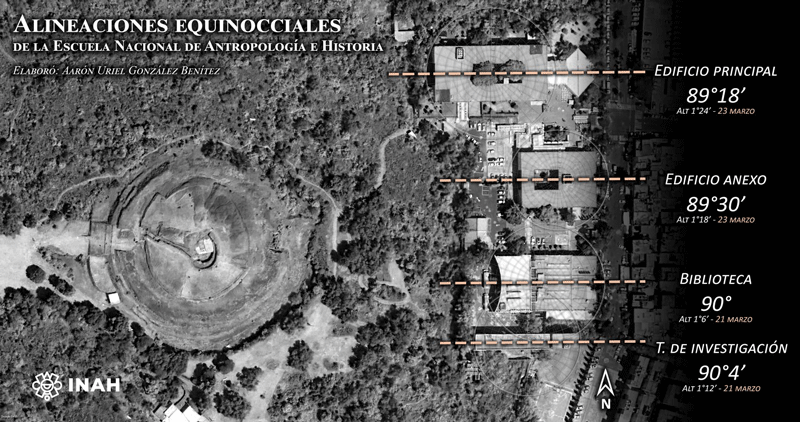 Asimismo, reveló que el edificio principal de la ENAH, así como el Anexo, la Biblioteca Guillermo Bonfil Batalla y la Torre de Investigación presentan una orientación similar a la de la urbe patrimonial, con una oscilación entre los 89° y los 90° acimutales (este geográfico), característica que los vincularía con el rumbo por donde se alza el sol durante los amaneceres equinocciales.