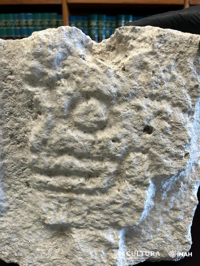 • El relieve tallado en roca, de estilo maya, representa un cráneo de perfil y formó parte de un muro de cráneos labrados
