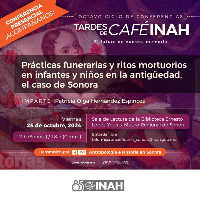La representación del Instituto Nacional de Antropología e Historia en Sonora invita a la conferencia Prácticas funerarias y ritos mortuorios en infantes y niños en la antigüedad, el caso de Sonora, que impartirá la antropóloga física Patricia Olga Hernández Espinoza, el viernes 25 de octubre de 2024, a las 17:00 horas.
