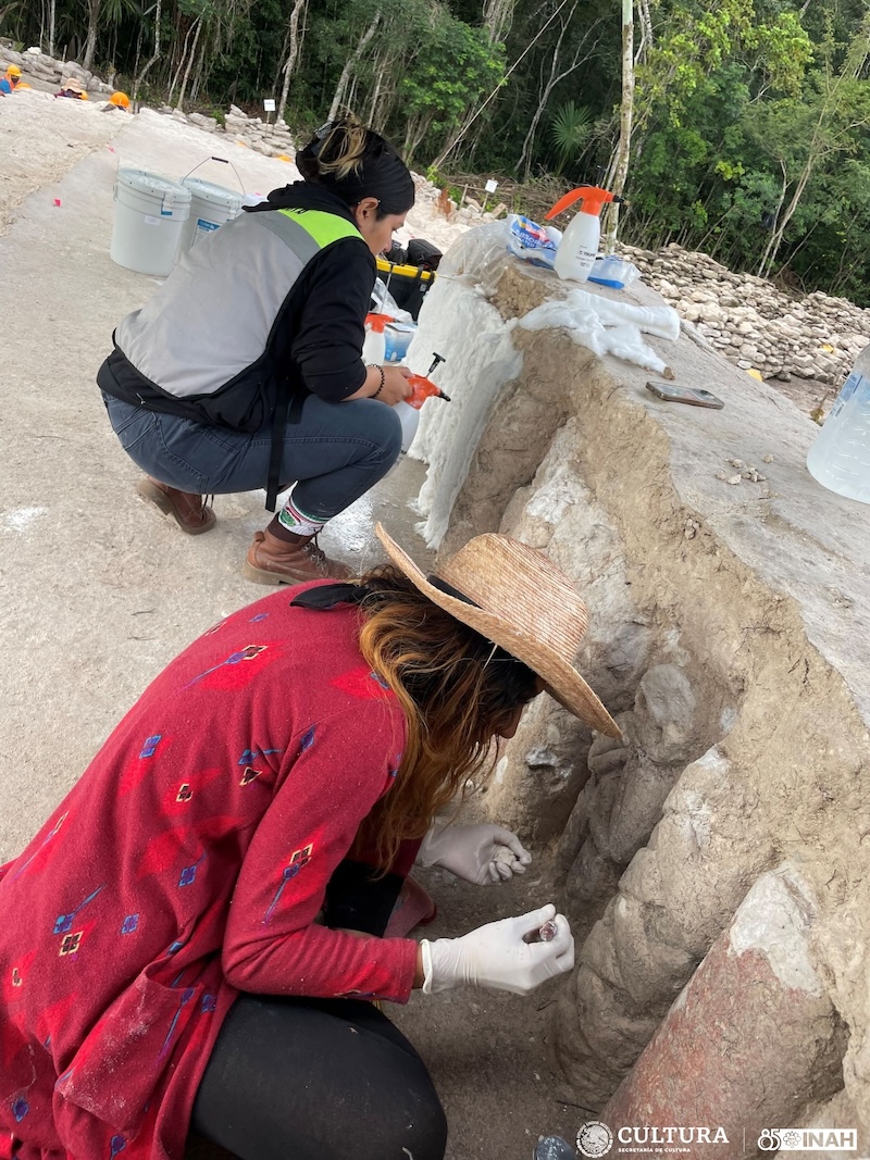 El equipo del Área de Conservación del Proyecto de Salvamento Arqueológico del Tren Maya está conformado por las restauradoras Aketzalli Yetlanezi Morán González, Verónica López Lira y Gabriela León Rodríguez. La arqueóloga del PSA, Francisca Alonso Flores, colaboró en la fase de excavación en el poblado de Nicolás Bravo, en Quintana Roo.