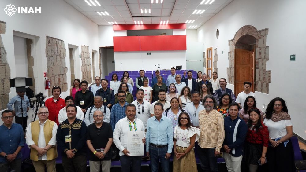 “Hueso de aguacate tallado”, procedente de Chimalhuacán, Estado de México, reconocido como Mejor Obra de Rescate, y “Dios con nosotros”, manta de algodón bordada con técnica de dos agujas, de iconografía mazahua, también trabajado por personas artesanas de Santiago, Villa de Allende, Estado de México, reconocida como Mejor Obra de Diseño.