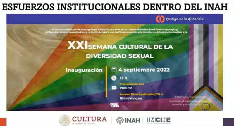 En este sentido, reconoció el interés del INAH en la reivindicación de los derechos de la comunidad LGBTQ+, con esfuerzos como el proyecto Antropología de la sexualidad: Cuerpo, género, vinculación afectiva, erotismo y reproductividad, de la Dirección de Antropología Física, iniciativa creadora de la Semana Cultural de la Diversidad Sexual; y el foro Visibilidad LGBTIQ+ en los museos, de la Coordinación Nacional de Museos y Exposiciones.