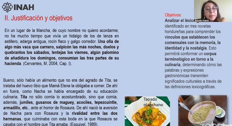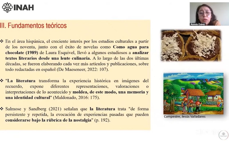 Acompañada por las investigadoras de la CNA, Edith Yesenia Peña Sánchez y Lilia Hernández Albarrán, quienes coordinan la actividad académica, la especialista en gastronarrativa, Águeda Chávez, puntualizó que “la alimentación es un elemento clave en la construcción de la identidad y la memoria histórica de las comunidades, un vehículo para la transmisión de conocimientos, valores y tradiciones”.