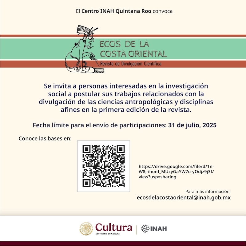 Con el objetivo de difundir conocimiento a partir de resultados de investigación del cuerpo académico del Instituto Nacional de Antropología e Historia (INAH) en Quintana Roo, y brindar una tribuna para antropólogos, arqueólogos, historiadores y otros académicos sociales enfocados en el Caribe mexicano y la frontera sur del país, próximamente saldrá a la luz la revista Ecos de la Costa Oriental.