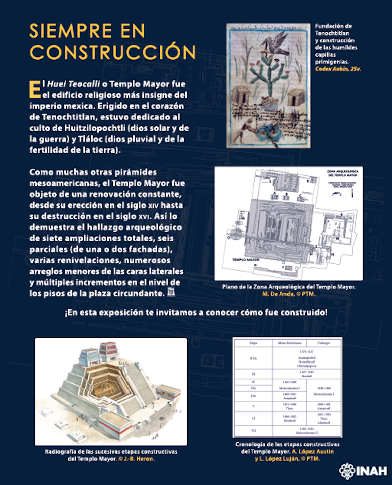 Compuesta por 16 cédulas de gran formato, la muestra temporal condensa y divulga los resultados de décadas de investigación del Proyecto Templo Mayor (PTM), adscrito al Instituto Nacional de Antropología e Historia (INAH).