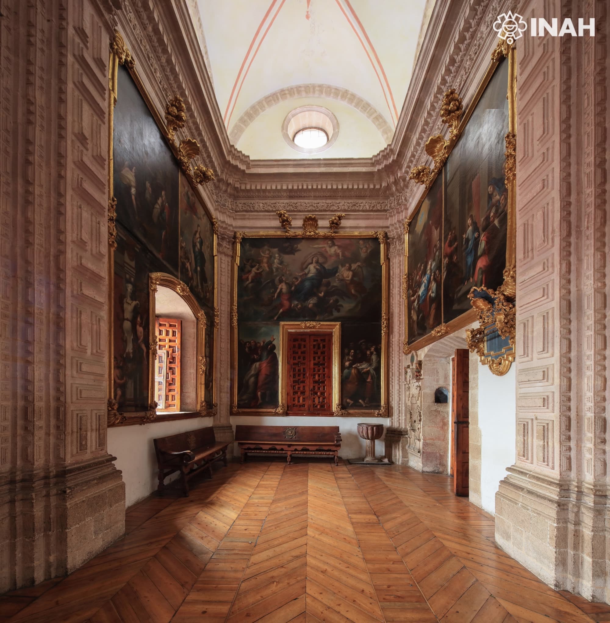 En su interior, además de soberbios retablos repujados en madera cubierta con papel de oro, exquisitos frescos y una prodigiosa pinacoteca, habita esta magnífica Sacristía, en la que se pueden apreciar múltiples lienzos alusivos a la vida de la Virgen María, obra del gran artista oaxaqueño Miguel Cabrera.