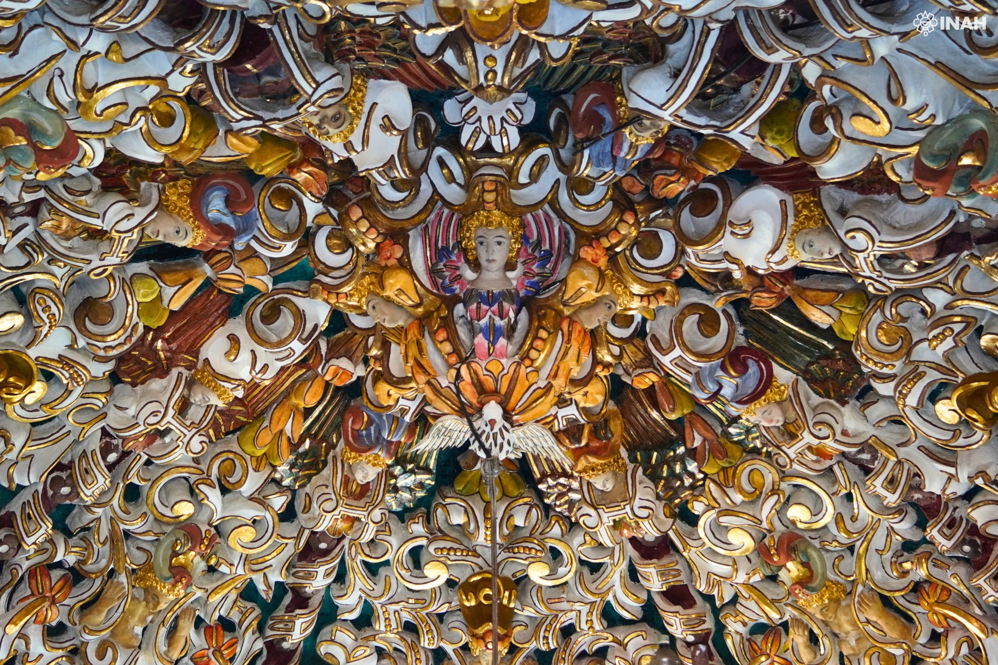 En San Andrés Cholula, Puebla, la iglesia de Santa María Tonantzintla es uno de los ejemplos más extraordinarios y bellos del barroco estucado novohispano. Sus interiores y cúpulas, cubiertas de santos, ángeles, querubines y un abigarrado repertorio decorativo, muestran un universo de formas y colores donde los tonos azules, rojos, rosas y dorados se entrelazan para envolver al espectador en una atmósfera celestial, en la que, como buen barroco, no hay espacio para el vacío.