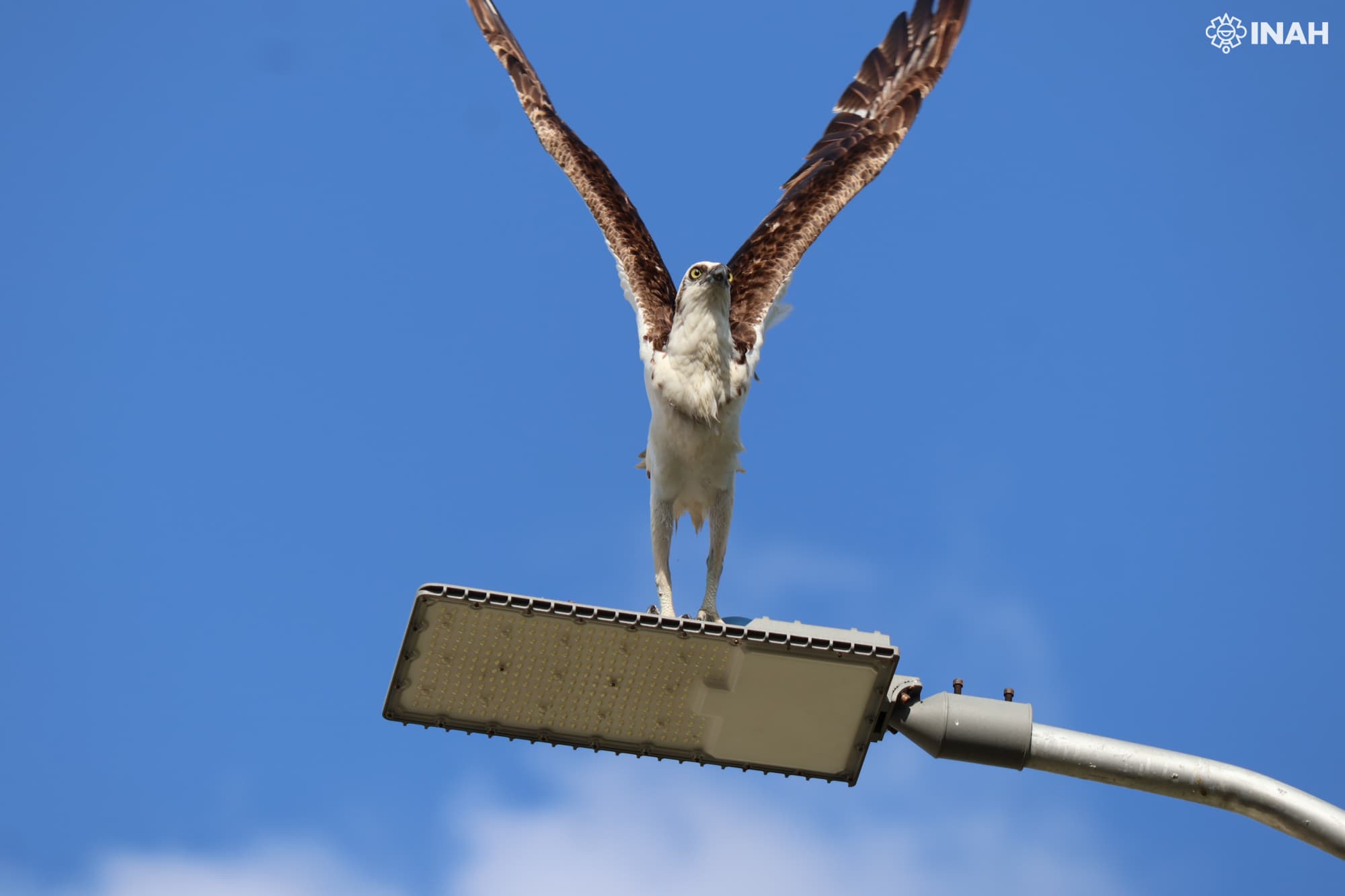 Además de ser parte del patrimonio cultural arqueológico del sur de México, El Meco, ubicado en la costa norte de Quintana Roo, es un sitio en el que diversas especies encuentran refugio. Tal es el caso de esta águila pescadora (Pandion haliaetus), a la que con frecuencia se le puede ver sobrevolando el sitio y, en ocasiones, posada sobre algún lugar muy alto, donde suelen construir grandes y cómodos nidos, que reutilizan y acondicionan cada año.