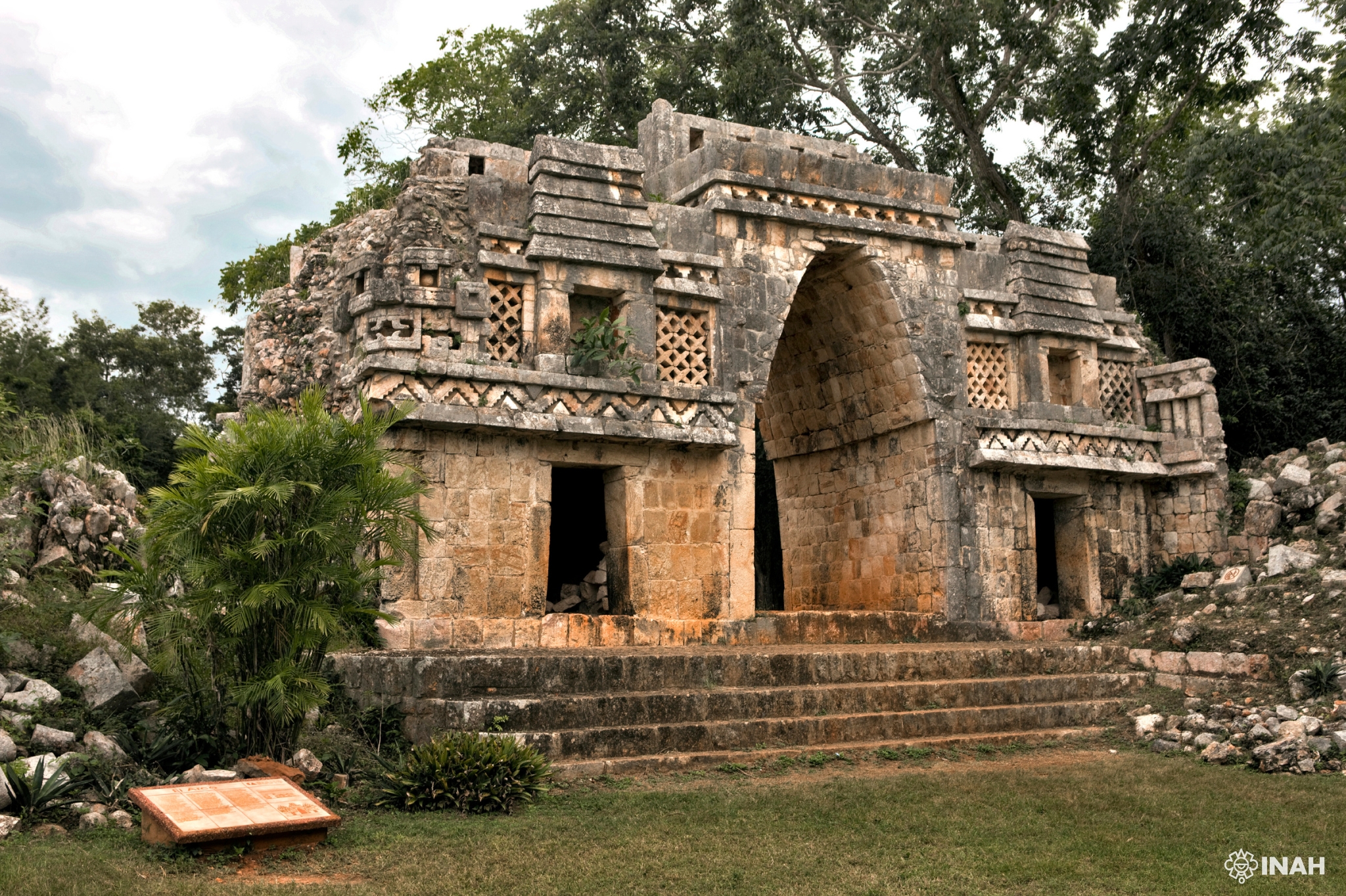 De proporciones imponentes (12.6 metros de largo, 4 de ancho y cerca de 5 de alto), el Arco cuenta con una cámara a cada lado y, en su fachada noroeste, dos nichos que aún conservan esculturas de estuco con restos de policromía. Su rica ornamentación, labrada en piedra, corresponde al estilo Puuc en su fase más refinada: grecas escalonadas, representaciones de chozas de palma y los distintivos mascarones del dios Chaac, “el Narigudo”, asociado con la lluvia y la fertilidad.