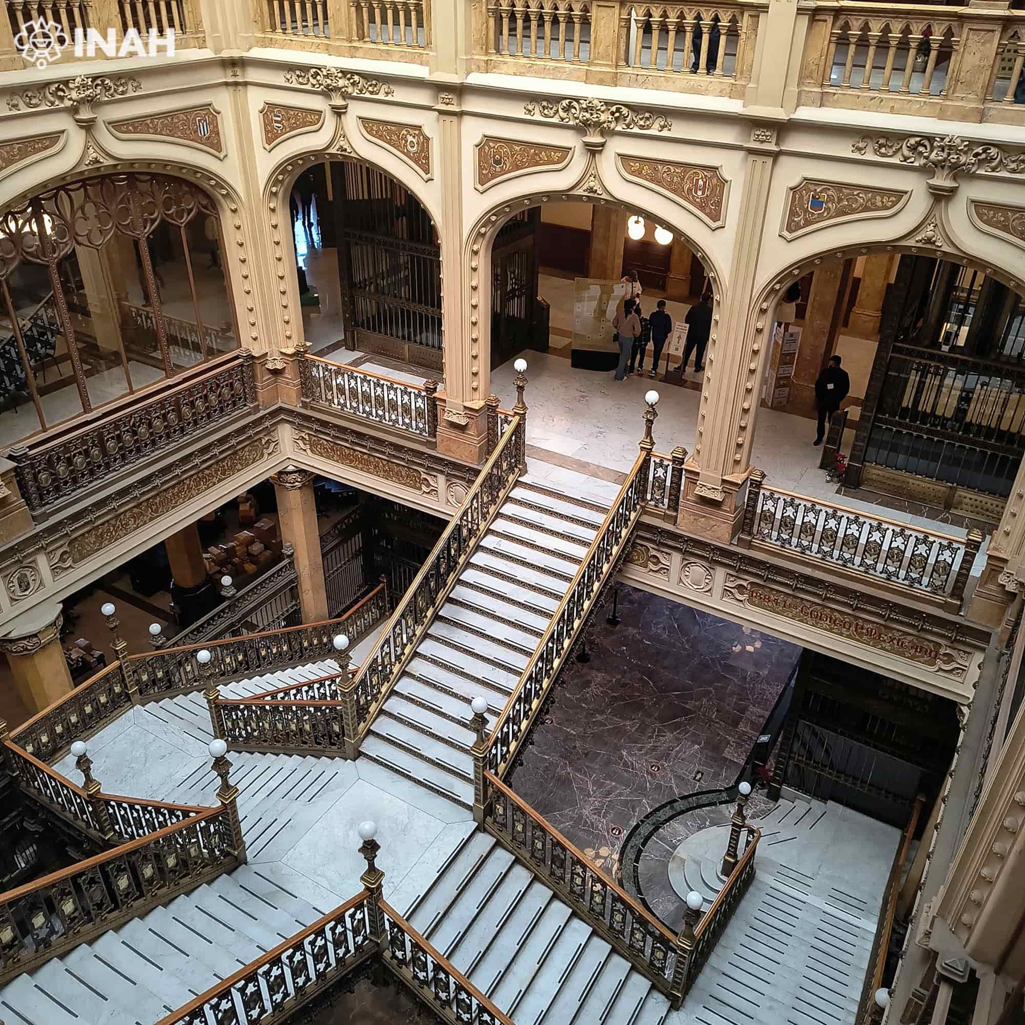 Su fachada está revestida en cantera de Chiluca, en la que sobresalen doradas gárgolas, dragones y farolas que invitan a los transeúntes a pasar por su entrada principal, donde se encuentra un elegante alfiz mudéjar, coronado por un monumental reloj alemán. En su interior, la belleza del mármol y el bronce italianos, así como la estructura metálica de acero traída de Nueva York, decoran el espacio caracterizado por su escalinata de cuatro niveles, así como su elevador, uno de los tres primeros que se instalaron en la ciudad.