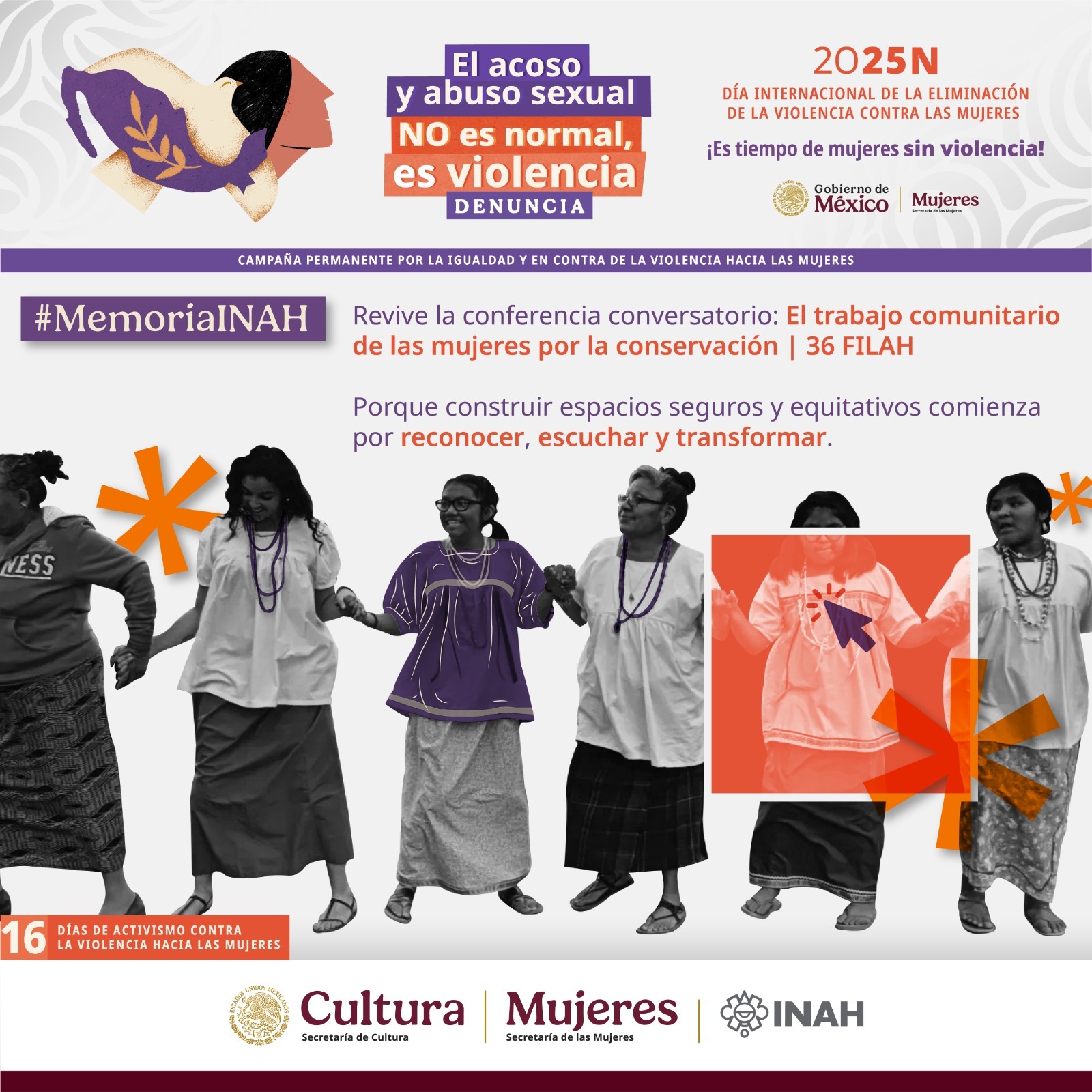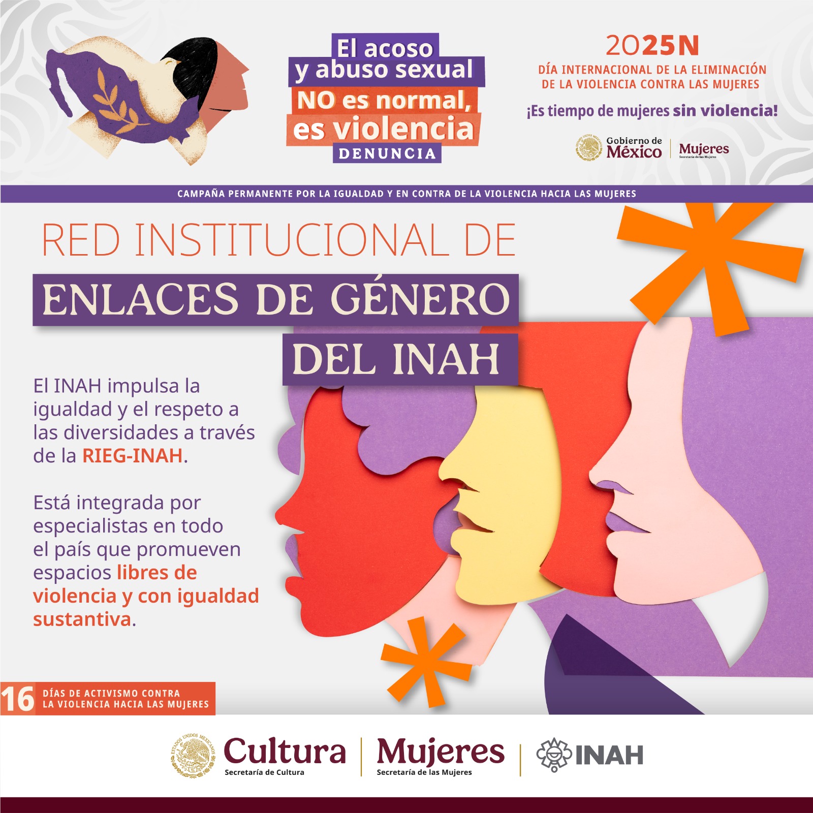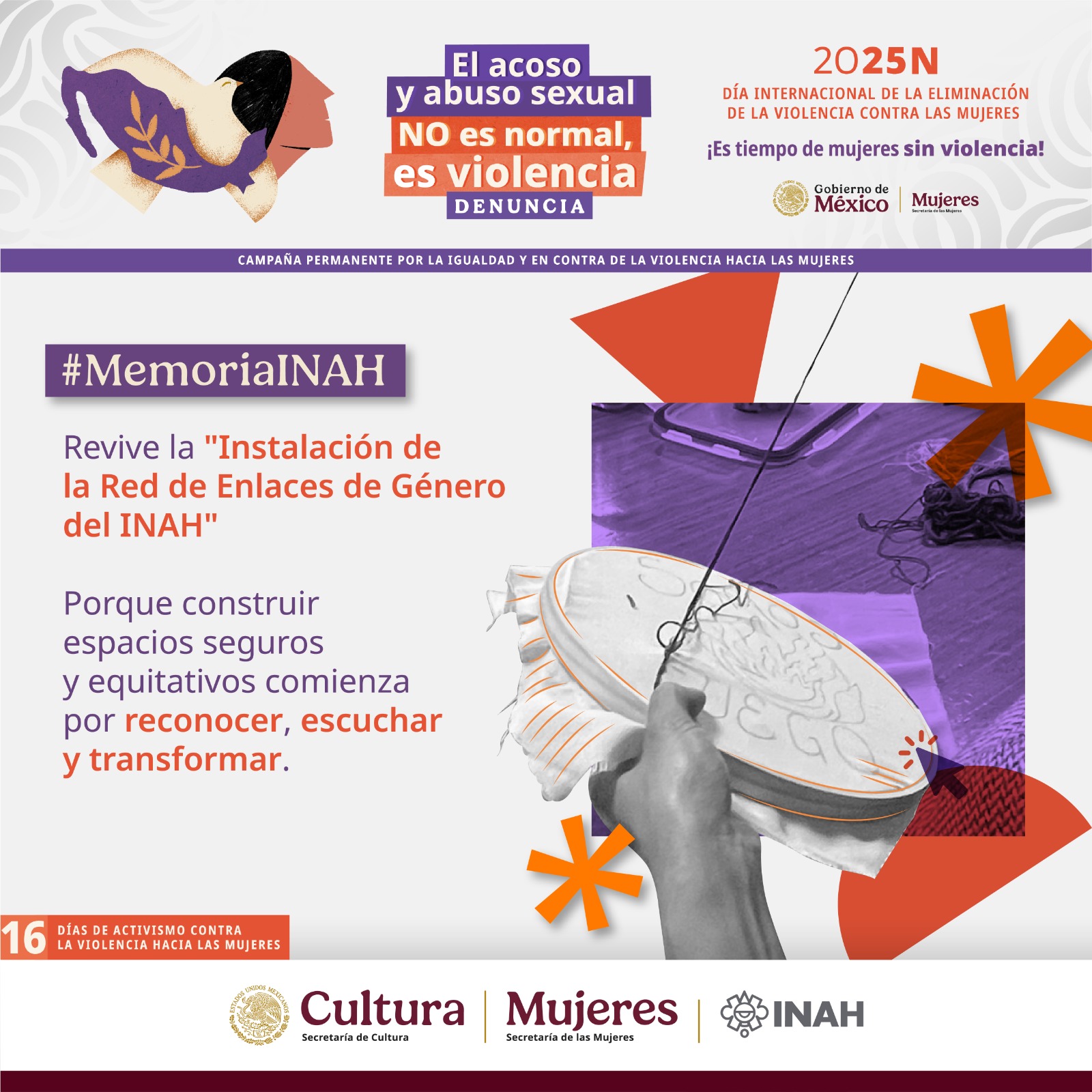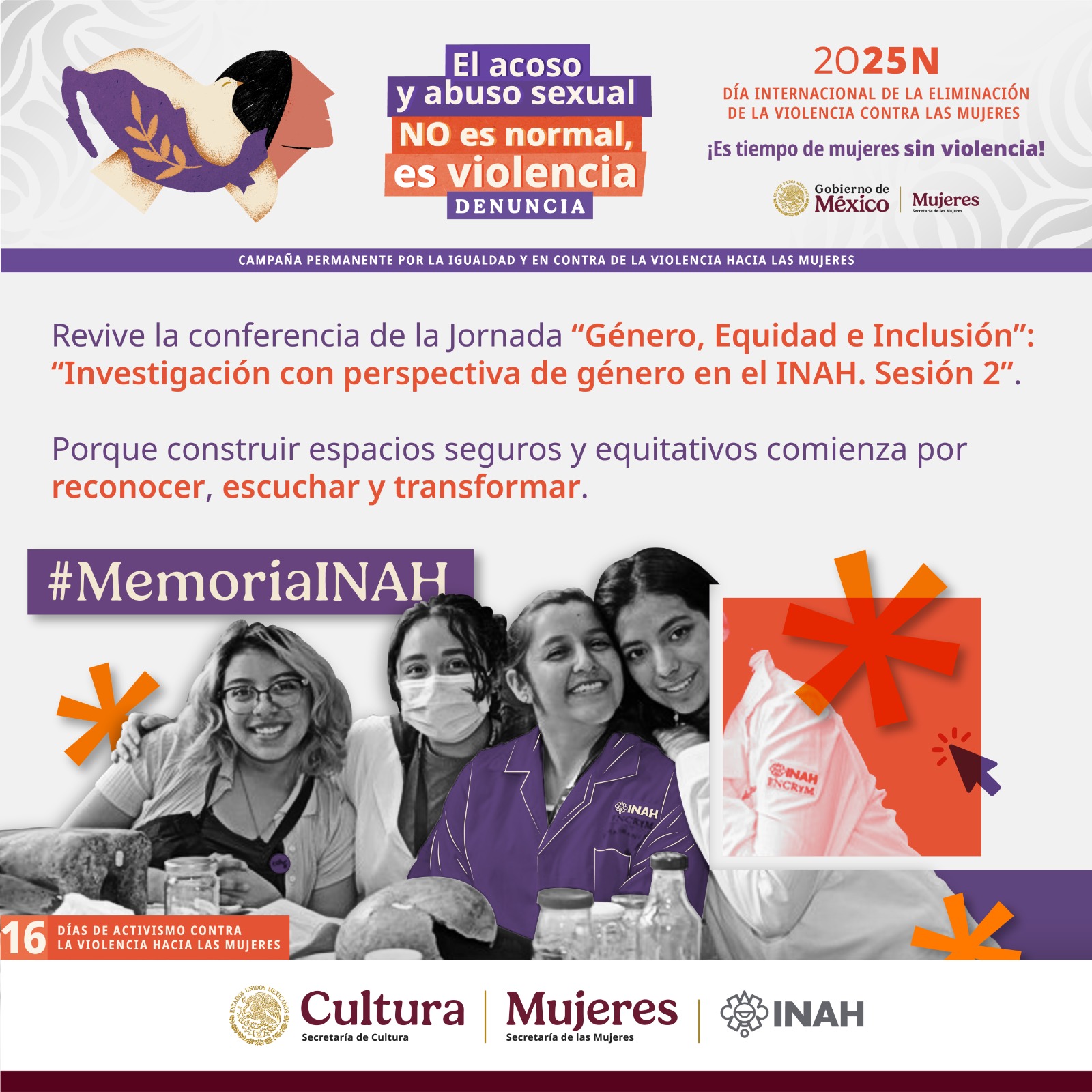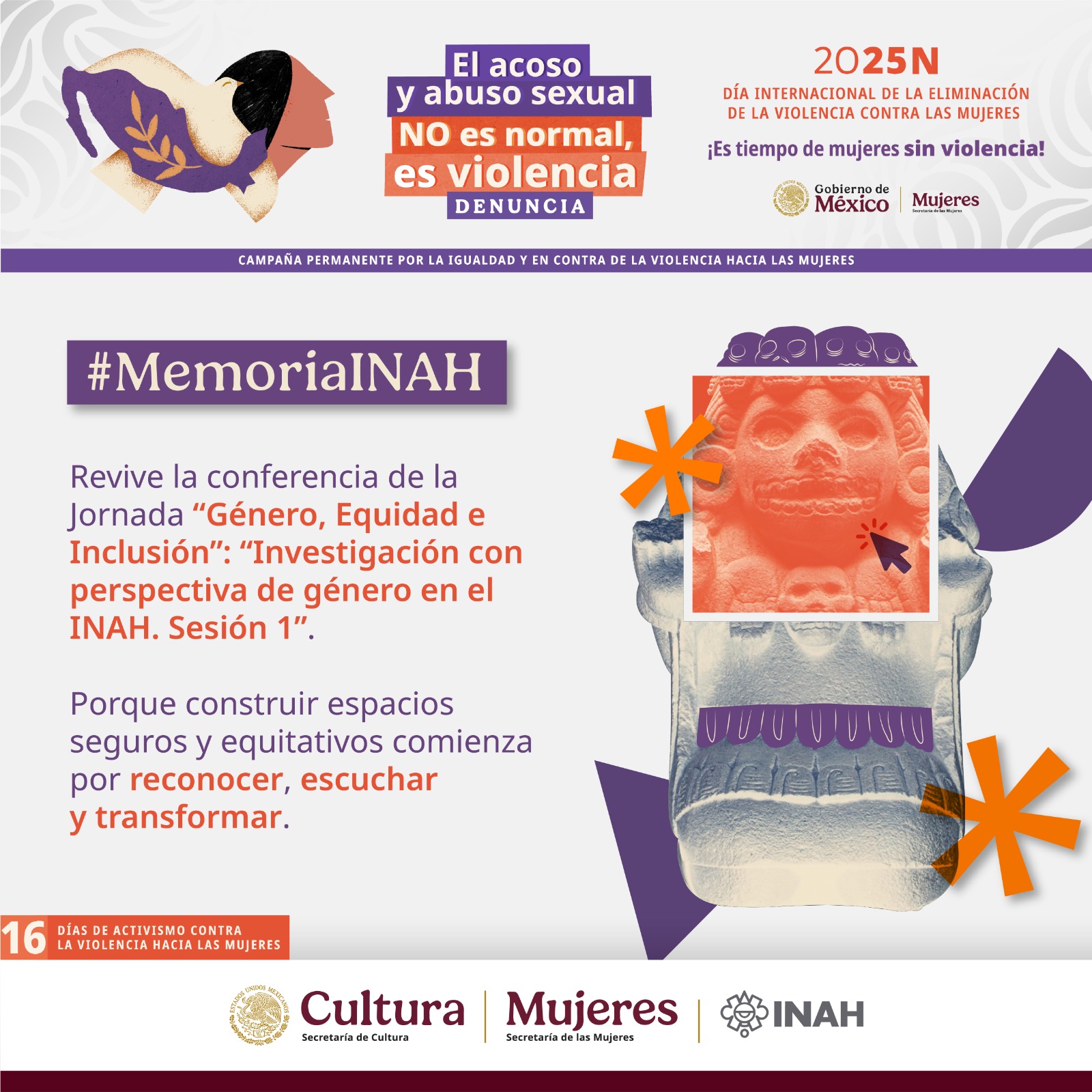 El Instituto Nacional de Antropología e Historia (INAH) se suma a la conmemoración del Día Internacional de la Eliminación de la Violencia contra la Mujer y a la campaña internacional de los “16 días de activismo contra la violencia de género”, que culmina el 10 de diciembre, Día Internacional de los Derechos Humanos.