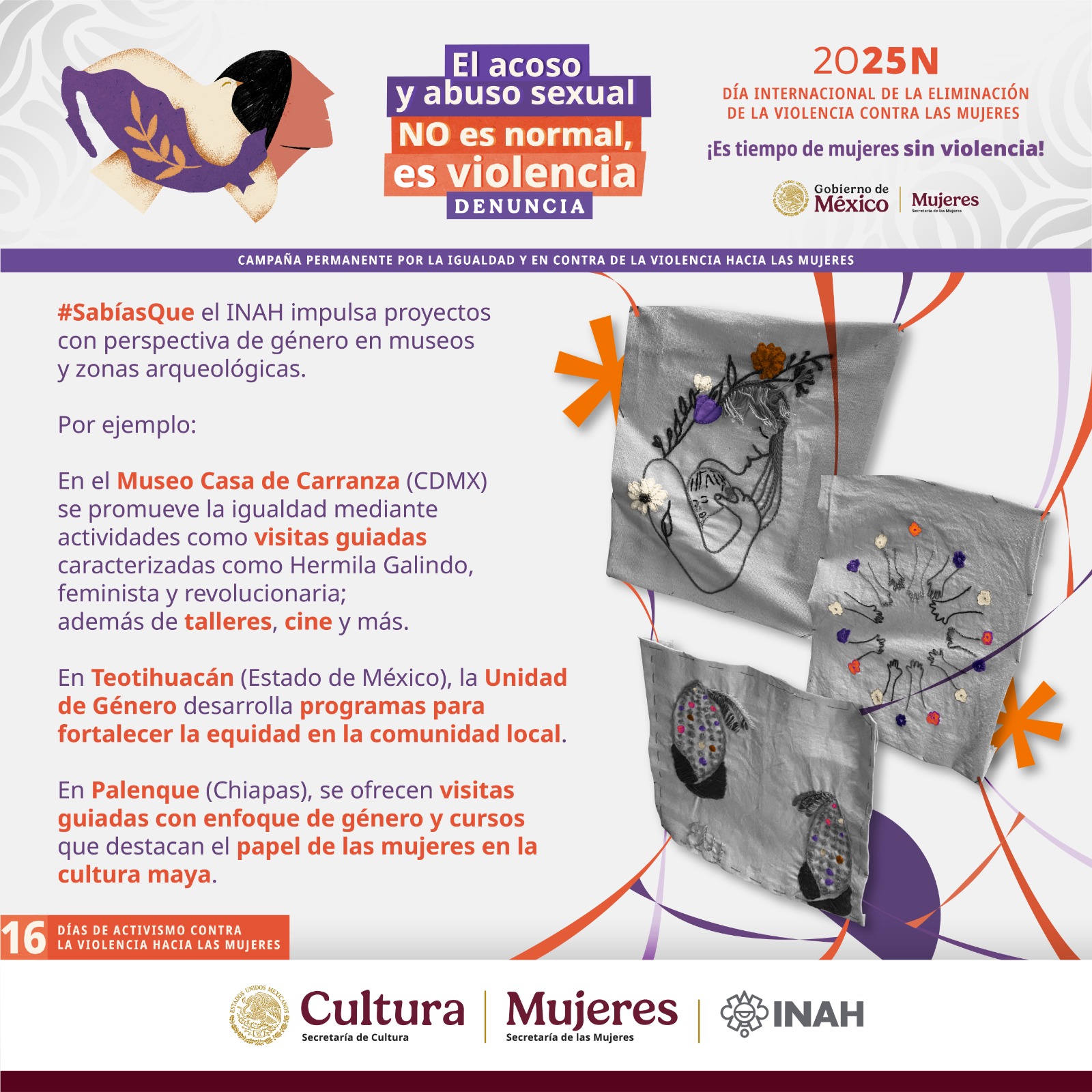 Durante las 16 jornadas de activismo, cada día podrás encontrar contenido nuevo relacionado con las iniciativas y propuestas que el INAH realiza, así como temas que visibilizan y reflexionan sobre la problemática con la finalidad de lograr espacios seguros y equitativos para las mujeres.